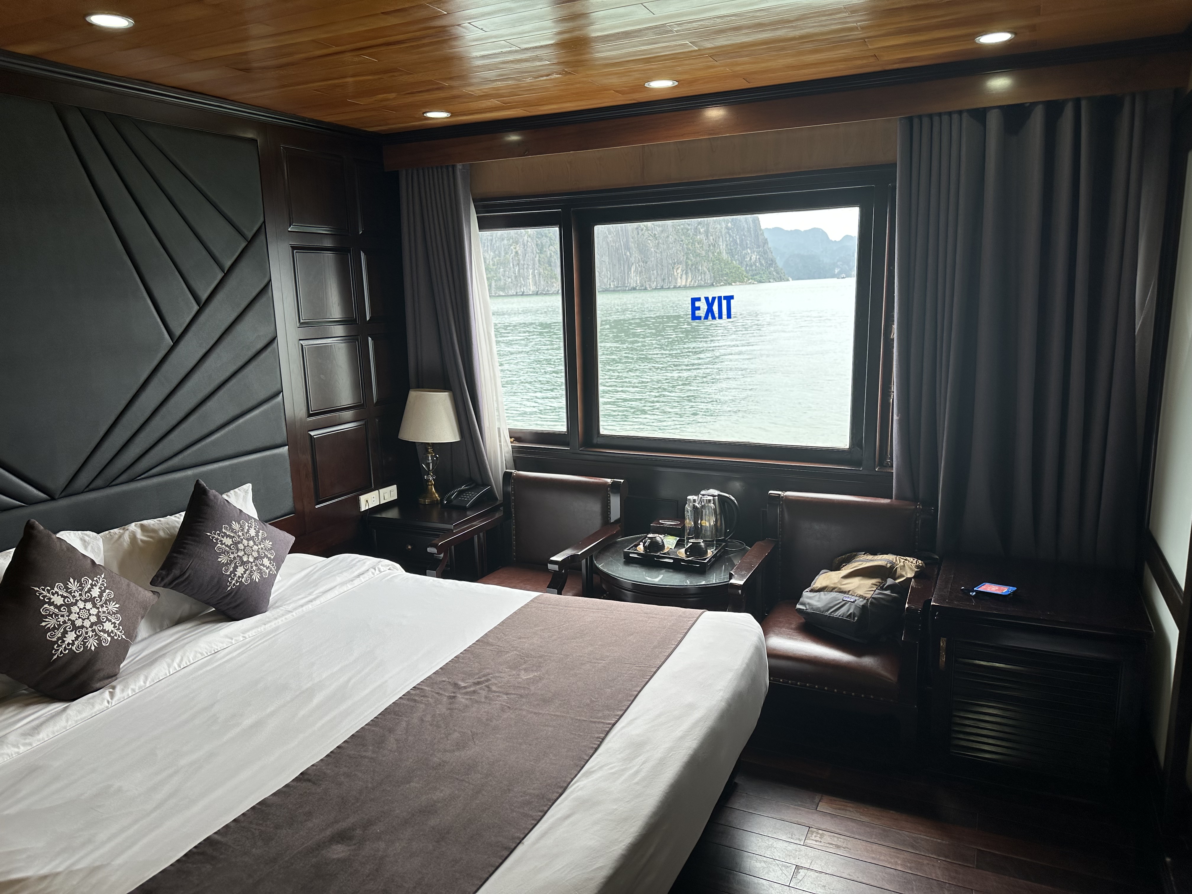 初日は、ハノイ市内の事務所に集まり出発となります。ハノイは相変わらず渋滞が激しいですが、そこを抜け高速道路を3時間ほど走ったでしょうか。奇抜な島々が海に浮かぶ景色が見え始めると、いよいよハロン湾に向かう船乗り場に到着します。船を乗り継いで、クルーズ船に乗船完了し、すぐさまレストランに全員集合。船上での注意事項の説明が長々とありましたが、いつものように、何を言っているのかさっぱりわかりません。もしかして、船が沈没した時の対処法とか説明してるんでしょうか。