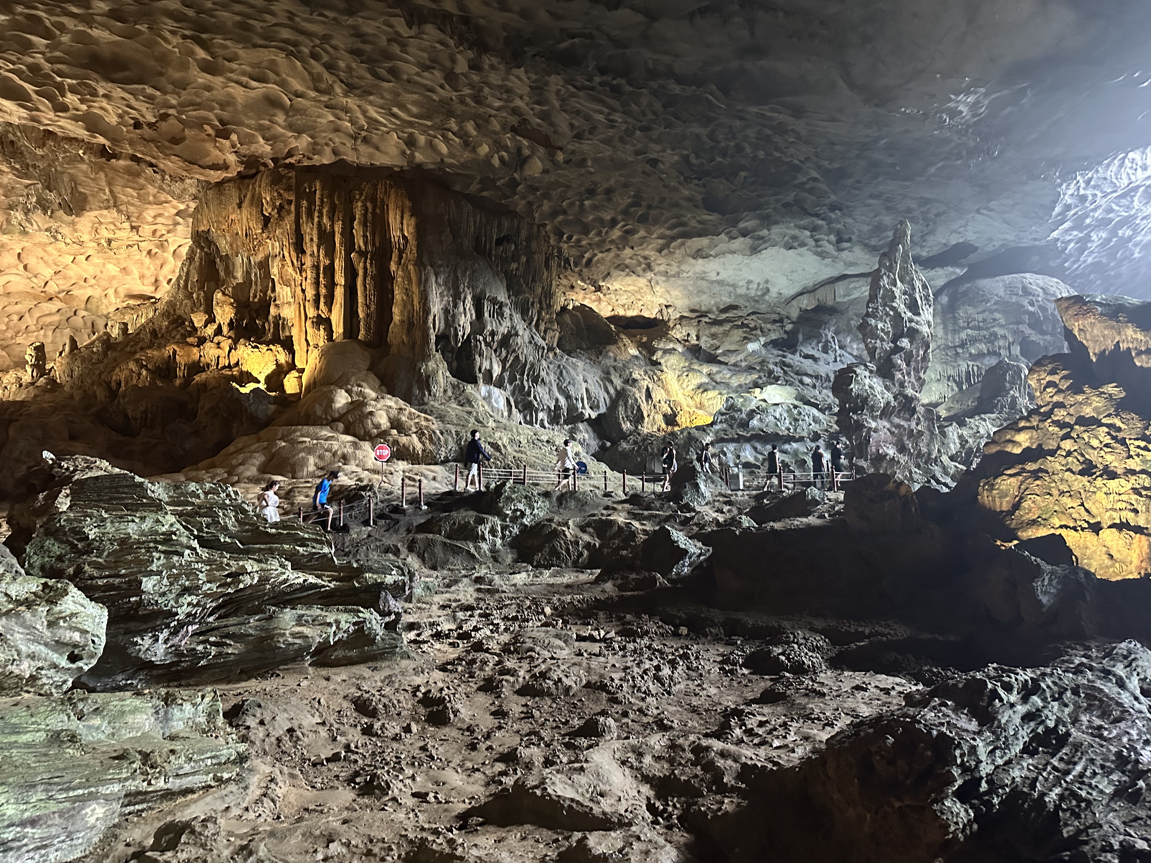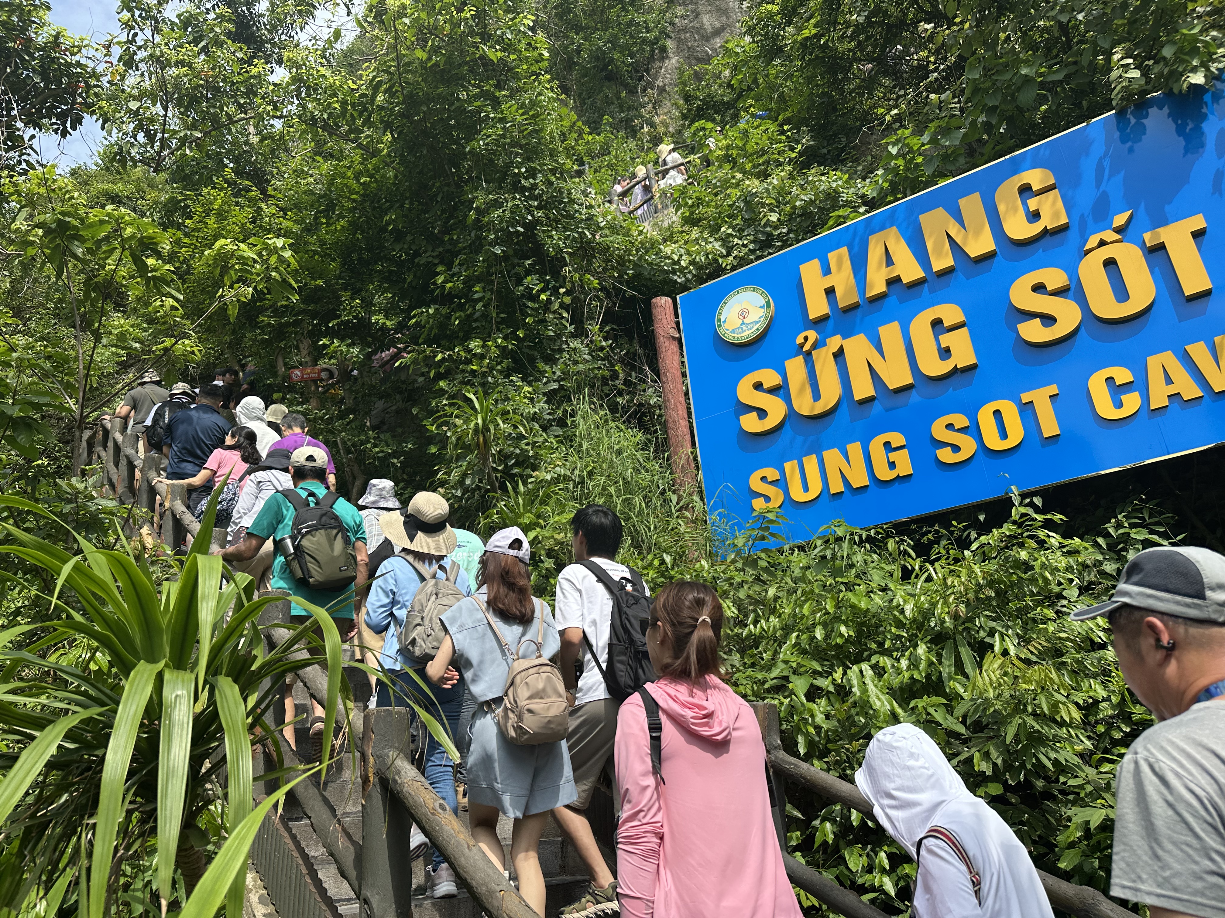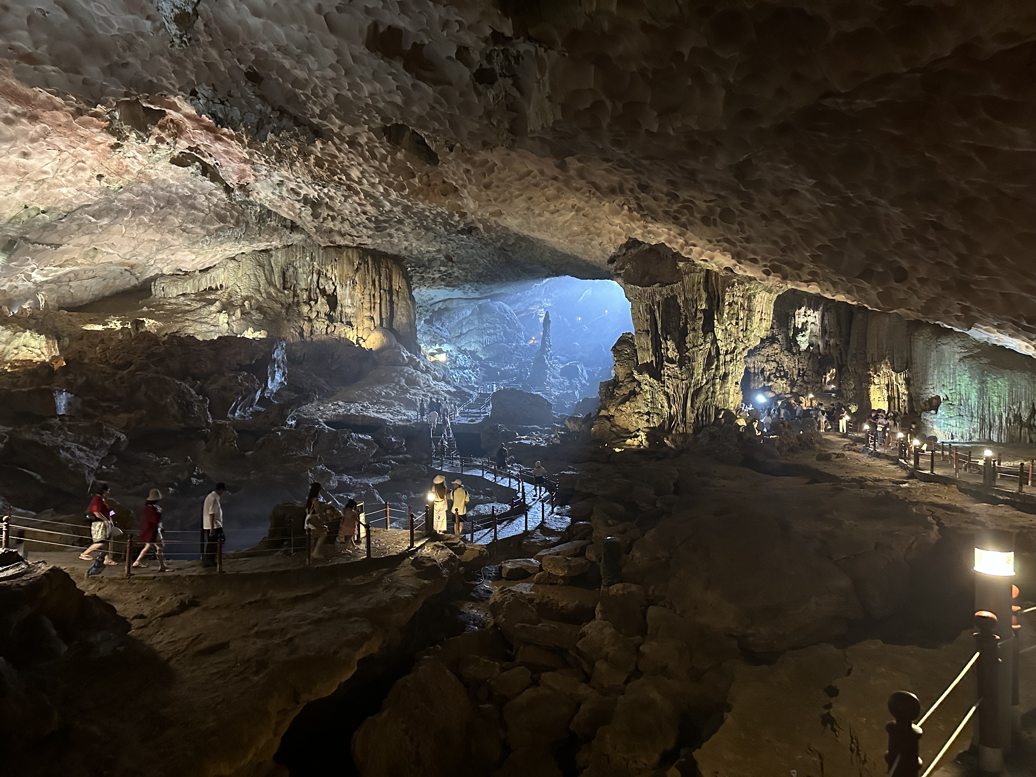 昼食は、景観を楽しみながらのレストランでのバイキングとなります。船はハロン湾に無数に点在する小さな島の間をゆっくりと進み続けます。若い社員達はその美しい景観には目もくれず、バイキング料理とおしゃべりに夢中です。そうこうしているうちに、船はスンソット鍾乳洞に到着。いよいよ観光開始です。